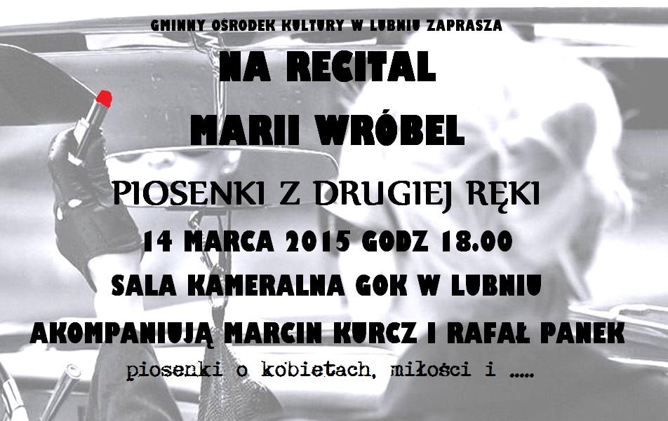 14 marca 2015r, w Gminnym Ośrodku Kultury w Lubniu odbył się recital p. Marii Wróbel. Wokalistce towarzyszył zespół w składzie Marcin Kurcz – klawisze i Rafał Panek – gitara. Ci bardzo utalentowani Wykonawcy znani są na scenie muzycznej od kilku lat. Koncert pn „Piosenki z drugiej ręki” zgromadził miłośników dobrej muzyki i pięknych tekstów. Artyści stworzyli niezwykły klimat nawiązując wspaniały kontakt z publicznością. P. Maria zaśpiewała piosenki z repertuaru m.in.Krystyny Prońko, Hanny Banaszak, Joanny Słowińskiej, Grażyny Łobaszewskiej, Wojciecha Młynarskiego. Dziękujemy Artystom za niezapomniany wieczór a Widzom za liczne przybycie.