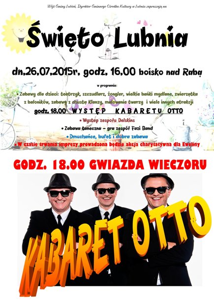 Już 26 lipca zapraszamy serdecznie na Święto Lubnia. Odbędzie się ono na boisku nad Rabą. Już od godziny 16.00 dzieci będą mogły uczestniczyć w różnorodnych zabawach przygotowanych specjalnie dla nich, m.in. zabawy z chustą Klanzy, pokaz wielkich baniek mydlanych, malowanie twarzy, zwierzątka z baloników, pokaz żonglowania, szczudlarz i .... teatrzyk.